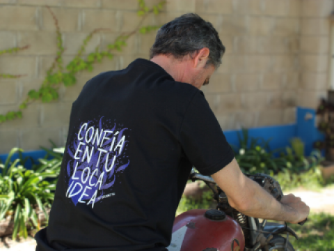Esta remera es un empujón, una invitación para que emprendas ese viaje y no solo nos referimos a uno en moto, el viaje de hacer lo que mueve tu corazón, tus pasiones y tu mejor versión. Una vez más CONFÍA EN TU LOCA IDEA.
